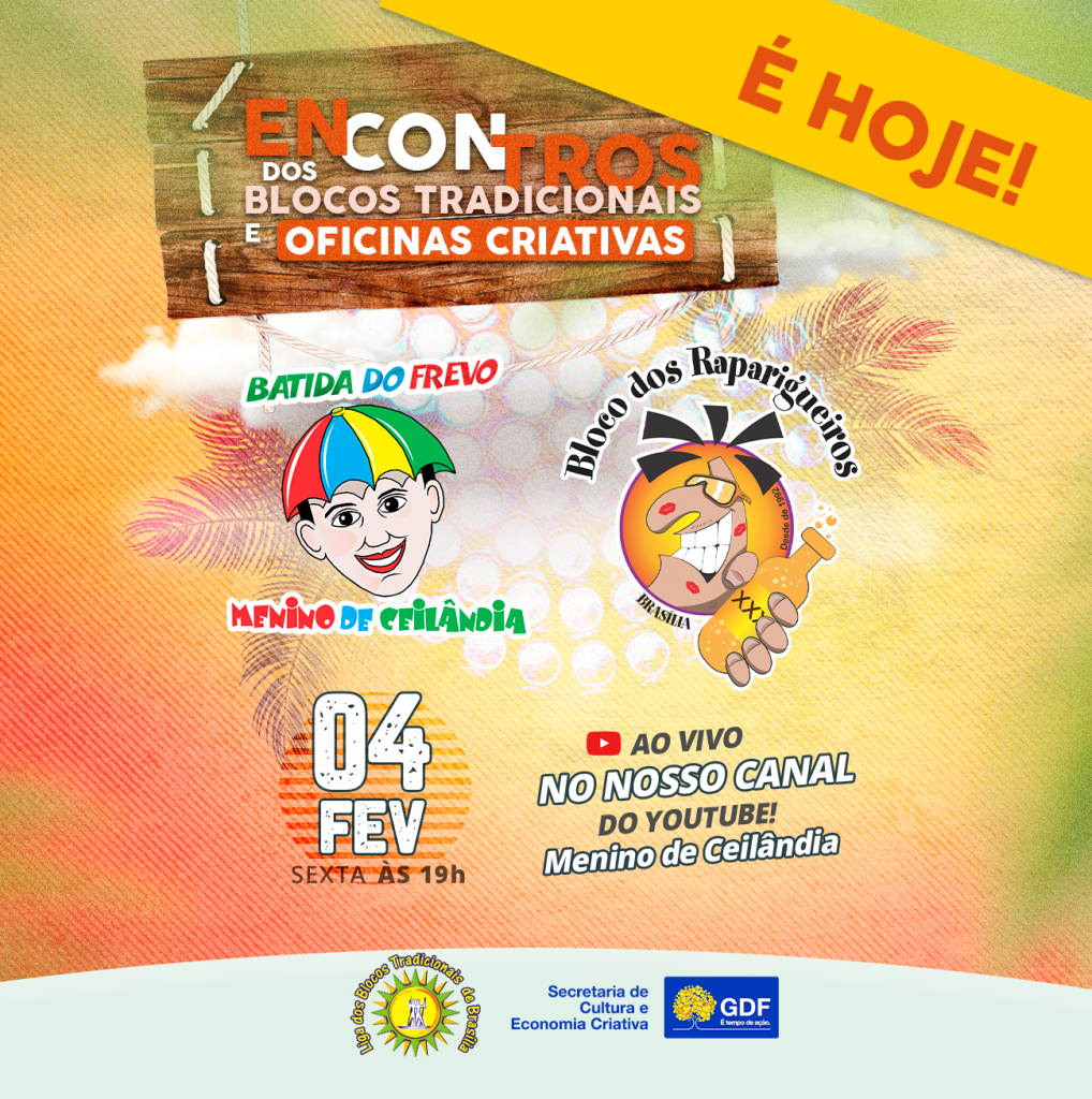 E pra começar o esquenta do fim de semana, na sexta, dia 4, seu encontro está marcado com a nossa live no YouTube. Nos Encontros dos Blocos Tradicionais e Oficinas Criativas, é a vez do Menino de Ceilândia receber o Bloco dos Raparigueiros. Atrações musicais e oficinas criativas esperam por você. Não perca! Nesta sexta, […]