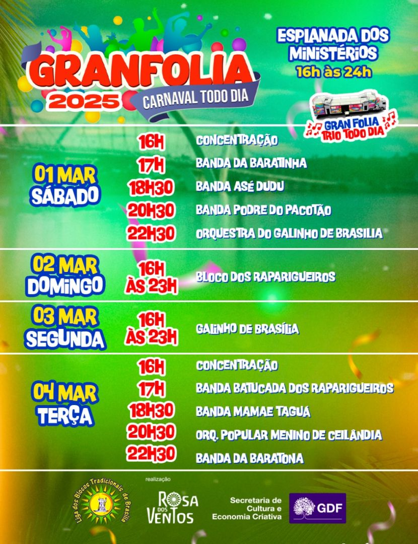 Brasília se prepara para um dos maiores eventos do seu Carnaval de rua: o Gran Folia 2025! Entre os dias 1º a 4 de março,